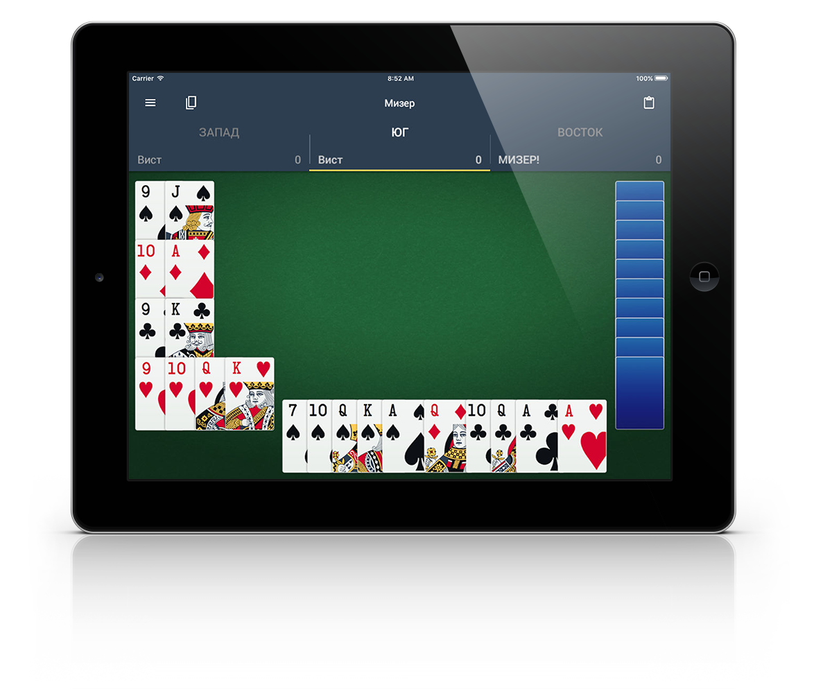 Тонко настроенные алгоритмы бота не дадут скучать даже опытным игрокам. Мельницы, впустки, честная ловля мизера, честные распасы - боты не подсматривают в карты и играют каждый за себя, а не против игрока. Есть возможность выбрать бота-шулера, чтобы сравнить.